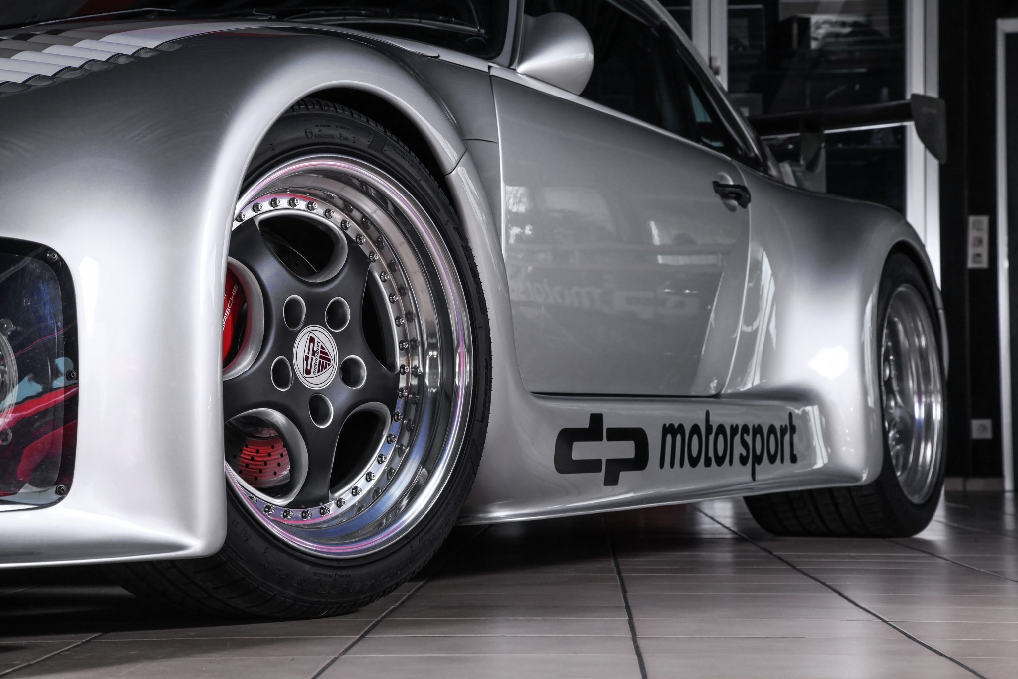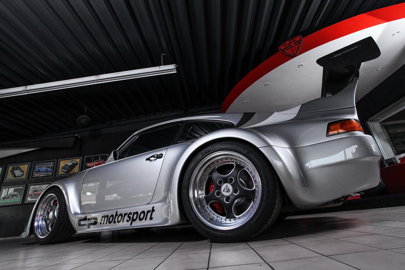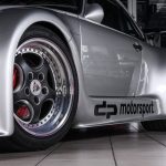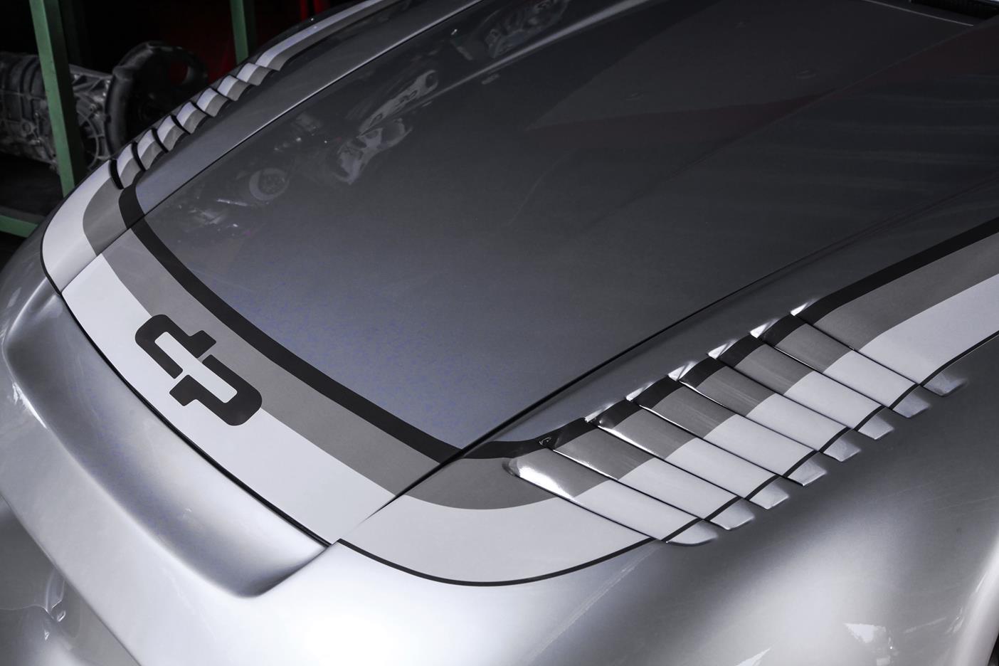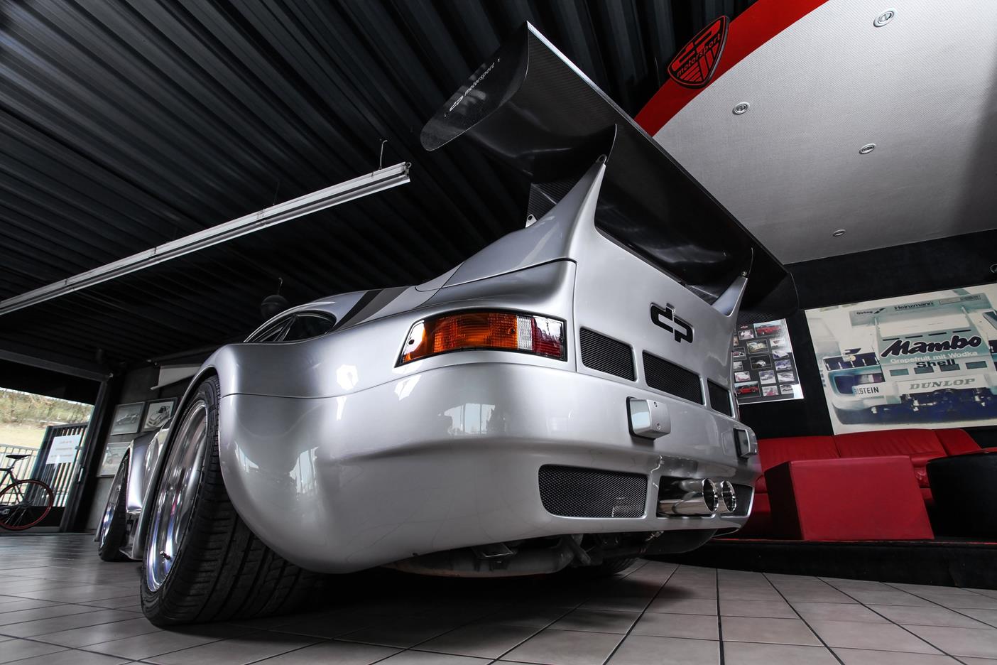 Und genau in diesem polarsilbernen Farbton mit Colorstreifen wurde das Straßenauto auf der Basis des 965 aufgebaut. Dafür wurden die Karosserieteile aus hochwertigem GFK mit diversen Verstärkungen aus Carbonfaser hergestellt. Der Motor wurde auf ca. 450 PS (= 330 kW) leistungsgesteigert. Neben einem Gewindefahrwerk von H&R wurden auch noch Unibal Domlager sowie eine verstellbare Domstrebe aus Aluminium installiert. Die adäquate Rad-Reifen-Kombination besteht aus dreiteiligen RH-Alufelgen im Cup-Look in 9×18 mit Bereifung in 245/40-18 an der VA bzw. in 12,5×18 mit 335/30-18 an der HA.