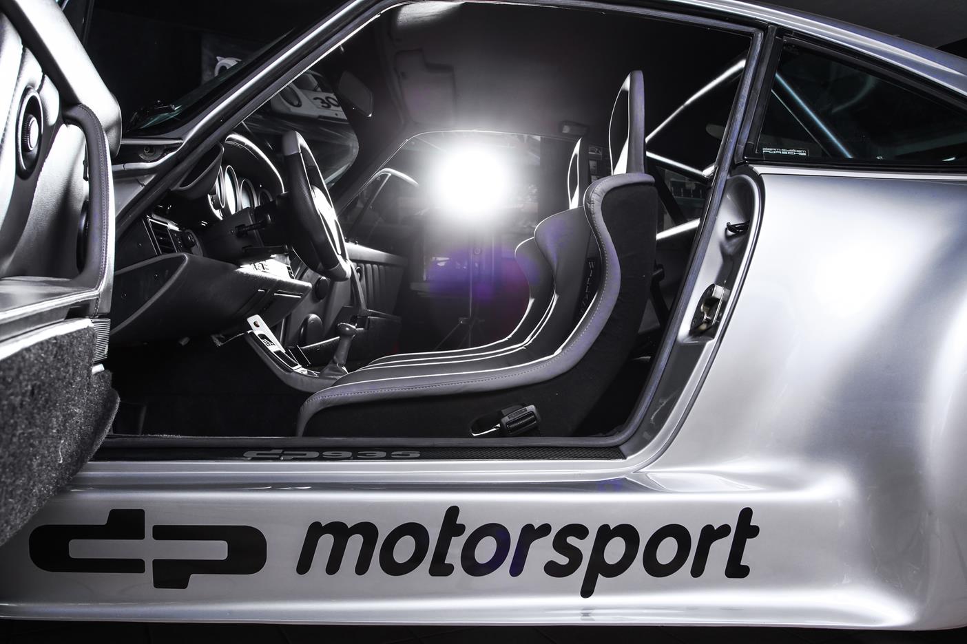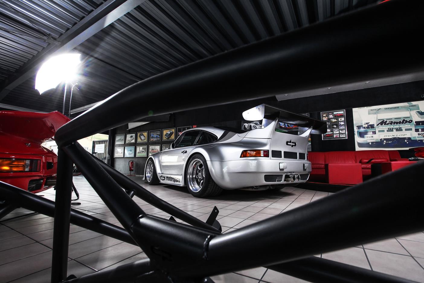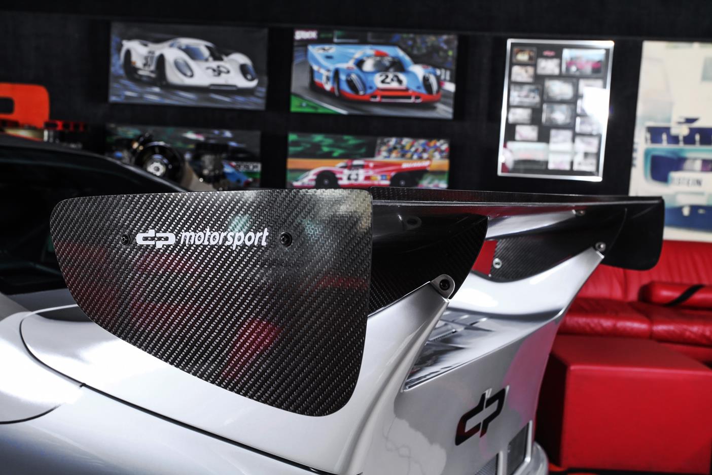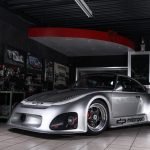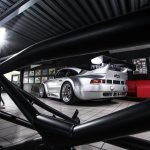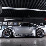 Und genau in diesem polarsilbernen Farbton mit Colorstreifen wurde das Straßenauto auf der Basis des 965 aufgebaut. Dafür wurden die Karosserieteile aus hochwertigem GFK mit diversen Verstärkungen aus Carbonfaser hergestellt. Der Motor wurde auf ca. 450 PS (= 330 kW) leistungsgesteigert. Neben einem Gewindefahrwerk von H&R wurden auch noch Unibal Domlager sowie eine verstellbare Domstrebe aus Aluminium installiert. Die adäquate Rad-Reifen-Kombination besteht aus dreiteiligen RH-Alufelgen im Cup-Look in 9×18 mit Bereifung in 245/40-18 an der VA bzw. in 12,5×18 mit 335/30-18 an der HA.