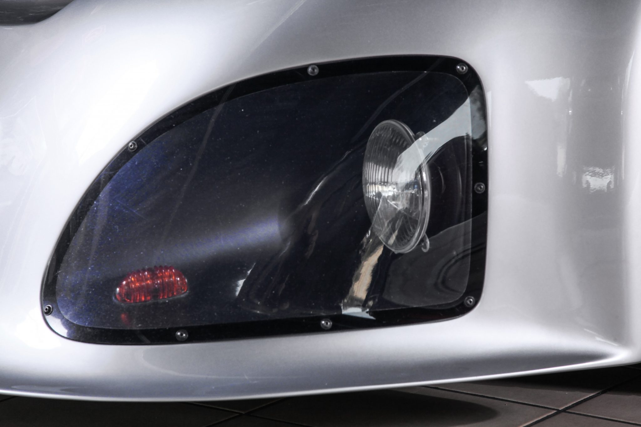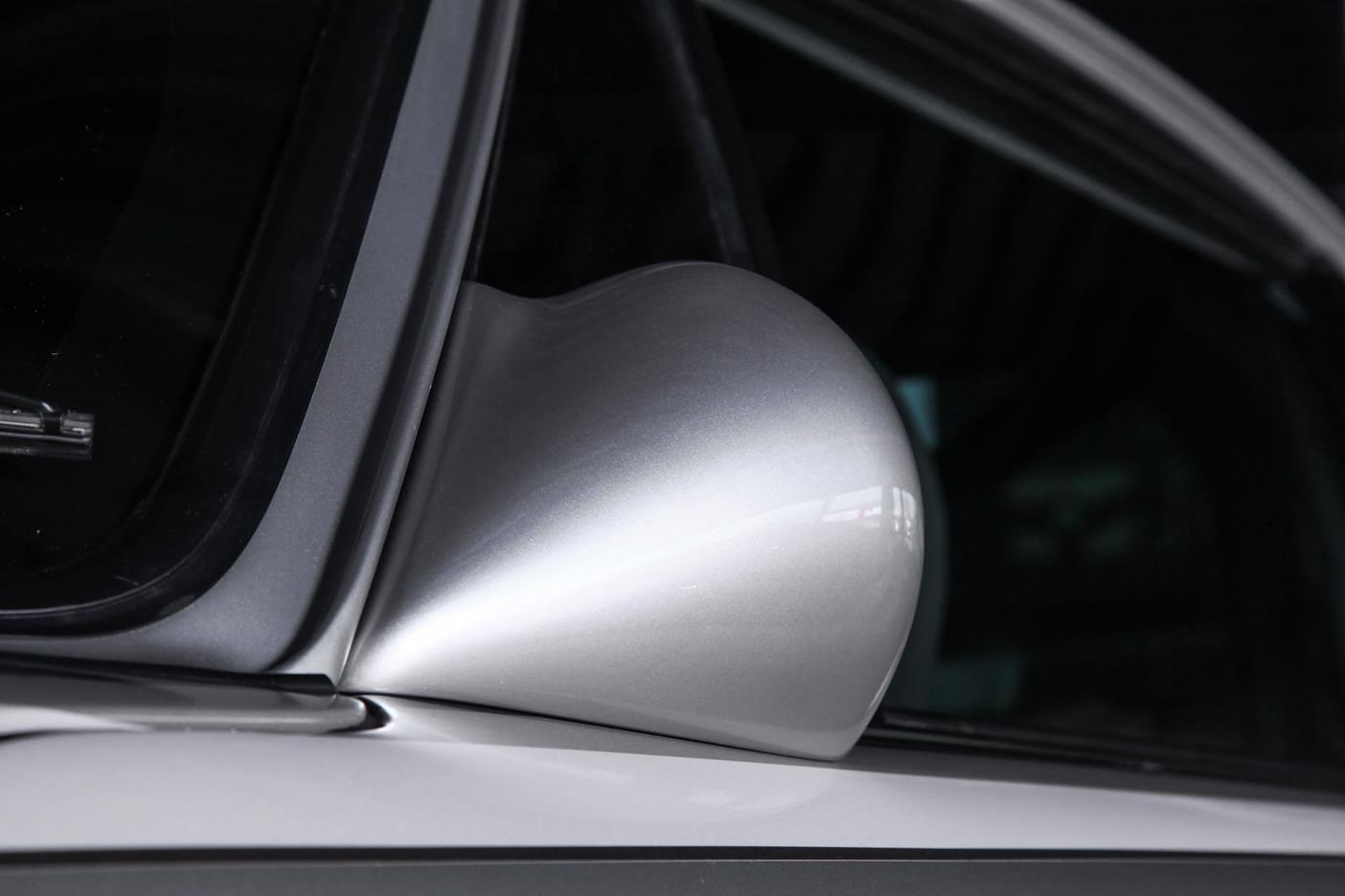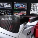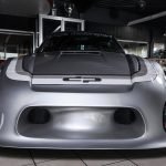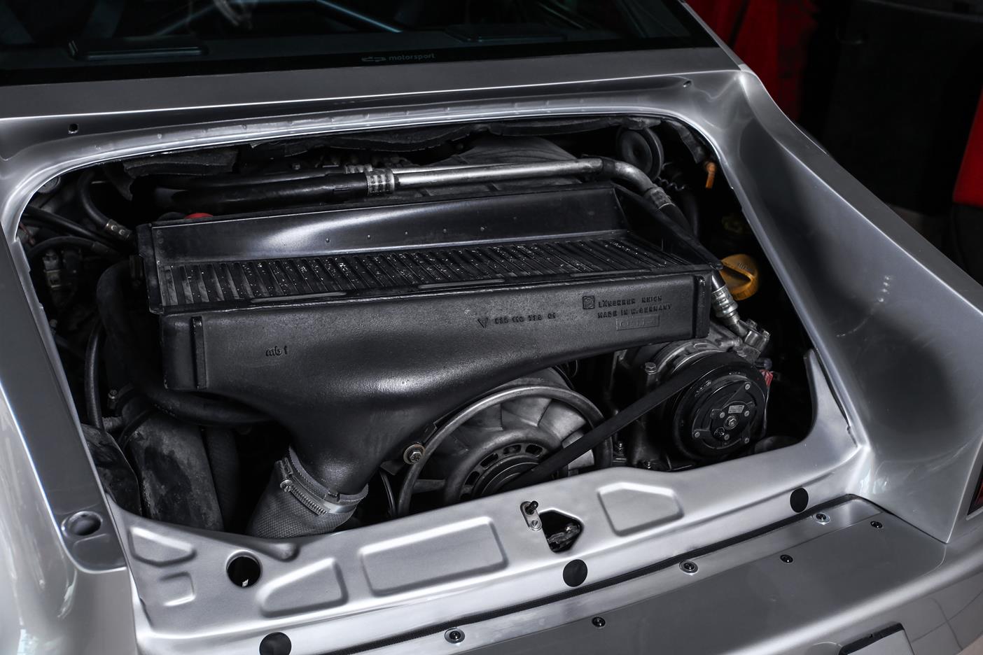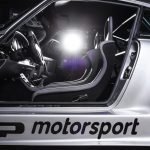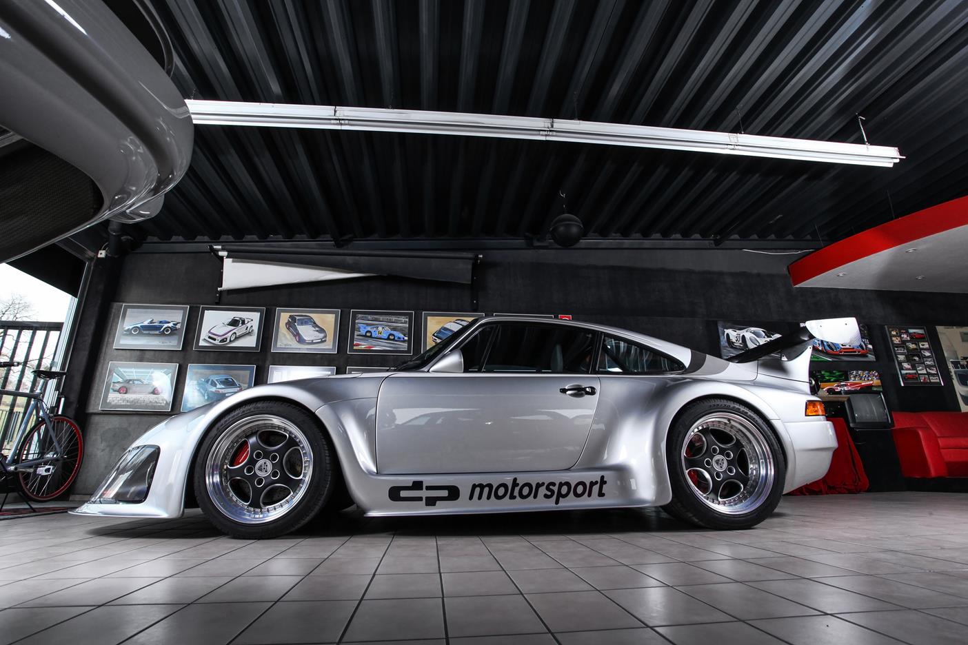 Und genau in diesem polarsilbernen Farbton mit Colorstreifen wurde das Straßenauto auf der Basis des 965 aufgebaut. Dafür wurden die Karosserieteile aus hochwertigem GFK mit diversen Verstärkungen aus Carbonfaser hergestellt. Der Motor wurde auf ca. 450 PS (= 330 kW) leistungsgesteigert. Neben einem Gewindefahrwerk von H&R wurden auch noch Unibal Domlager sowie eine verstellbare Domstrebe aus Aluminium installiert. Die adäquate Rad-Reifen-Kombination besteht aus dreiteiligen RH-Alufelgen im Cup-Look in 9×18 mit Bereifung in 245/40-18 an der VA bzw. in 12,5×18 mit 335/30-18 an der HA.