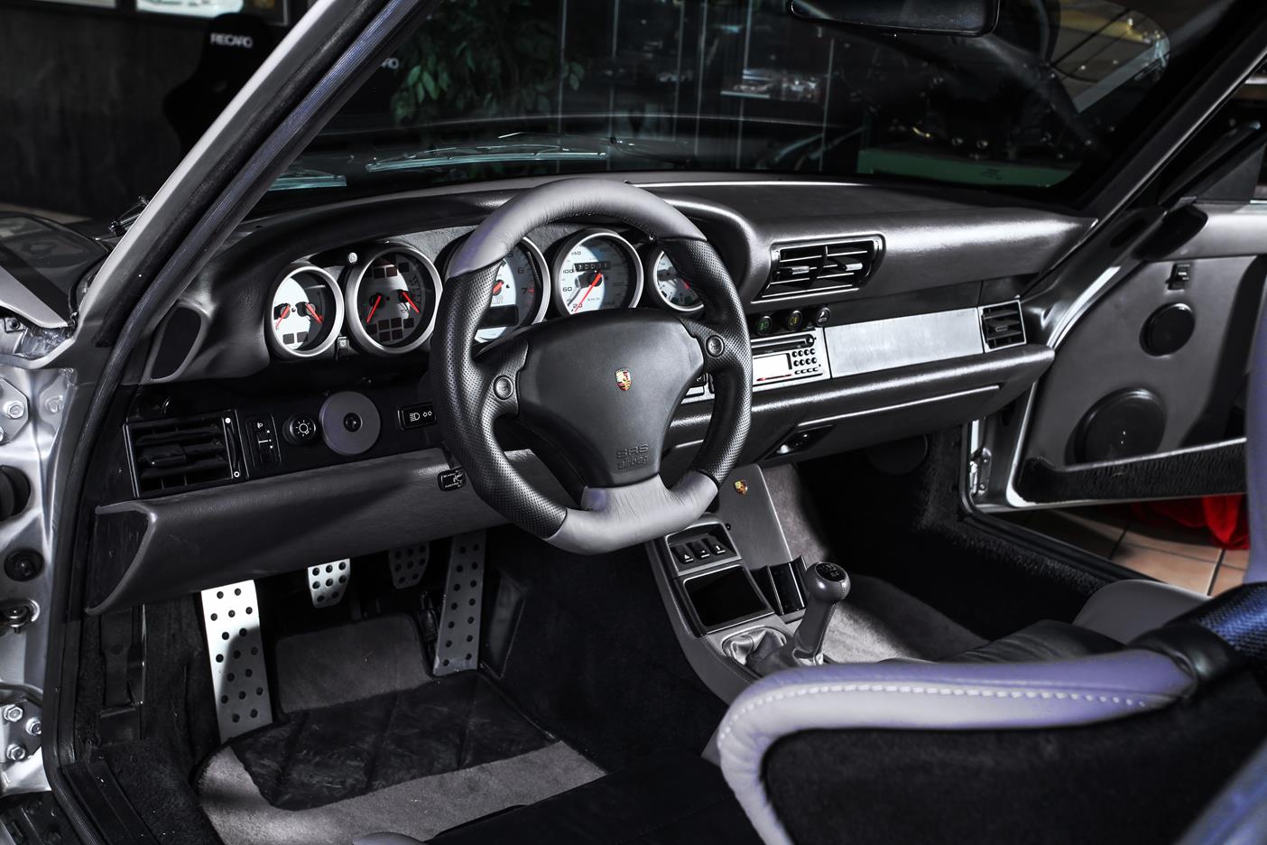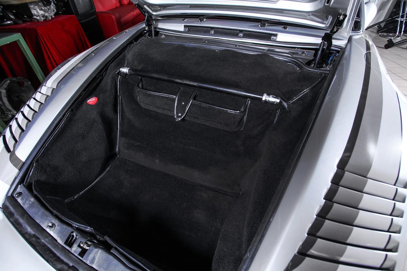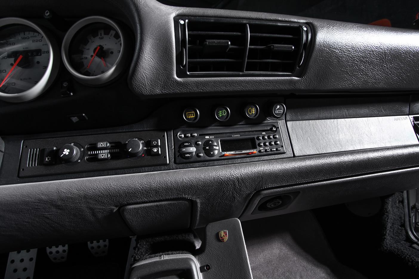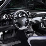 Auch das Interieur kam nicht ungeschoren davon. Dort wurde Leder in Classic-grau mit schwarz kombiniert verarbeitet. Ein Airbag-Sportlenkrad und dazu noch ein Clubsport-Überrollbügel unterstreichen die sportlichen Ambitionen von Auto und Fahrer, der – bei Bedarf nebst Beifahrer – in 935-Lollipop-Sitzen, ebenfalls in Classic-grau mit schwarz kombiniert, Platz nimmt.