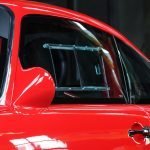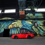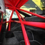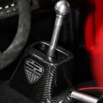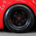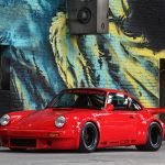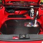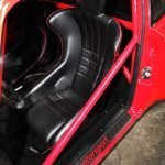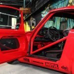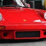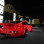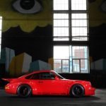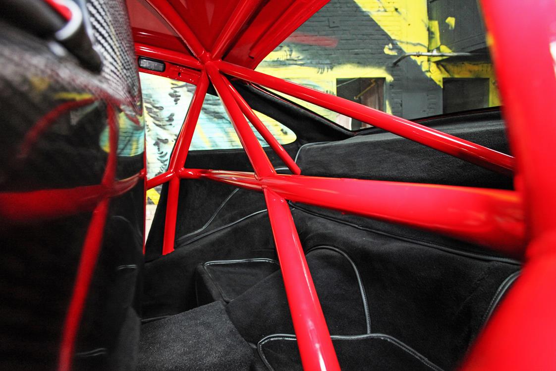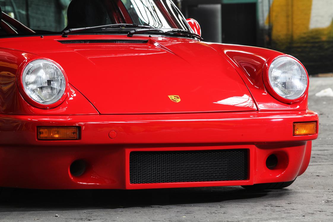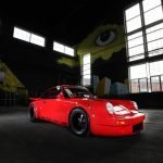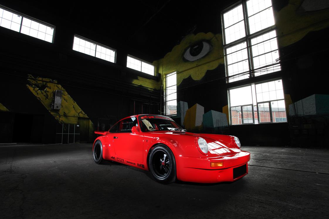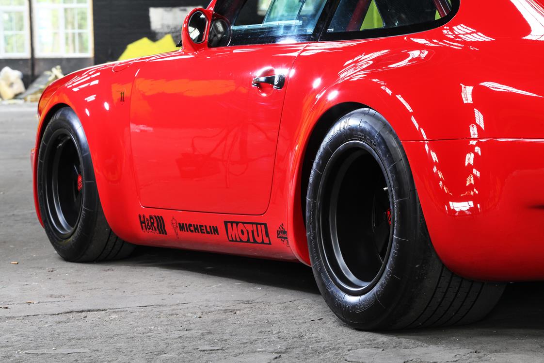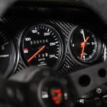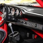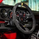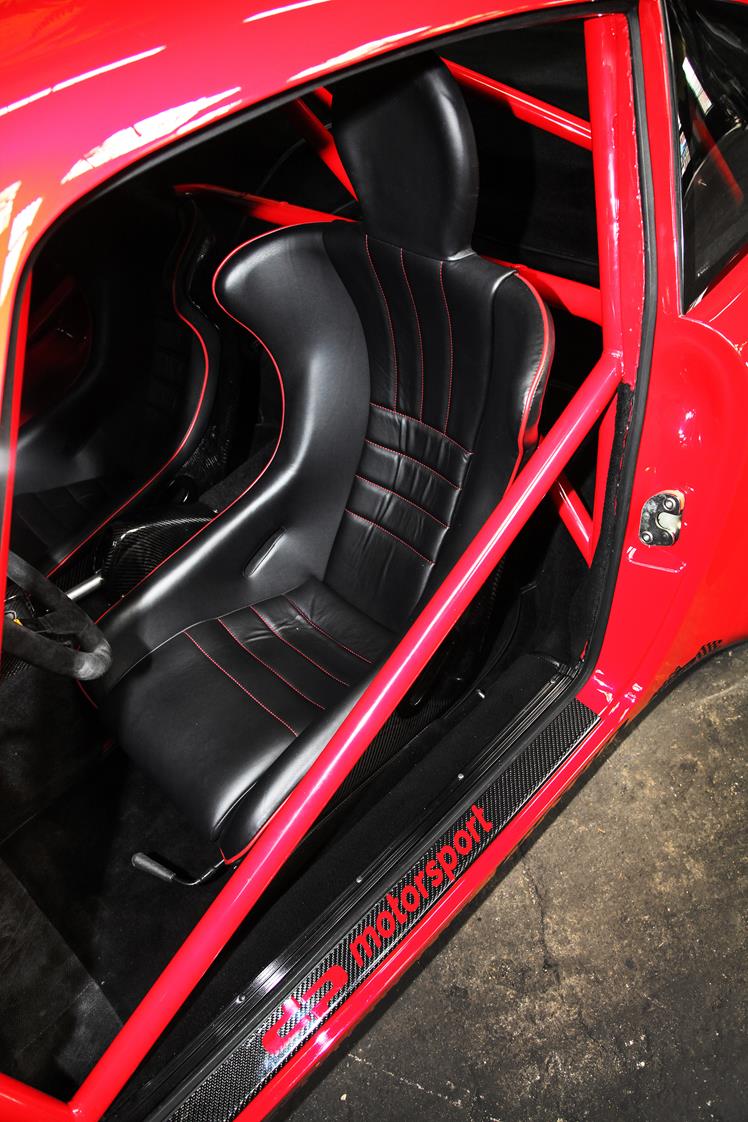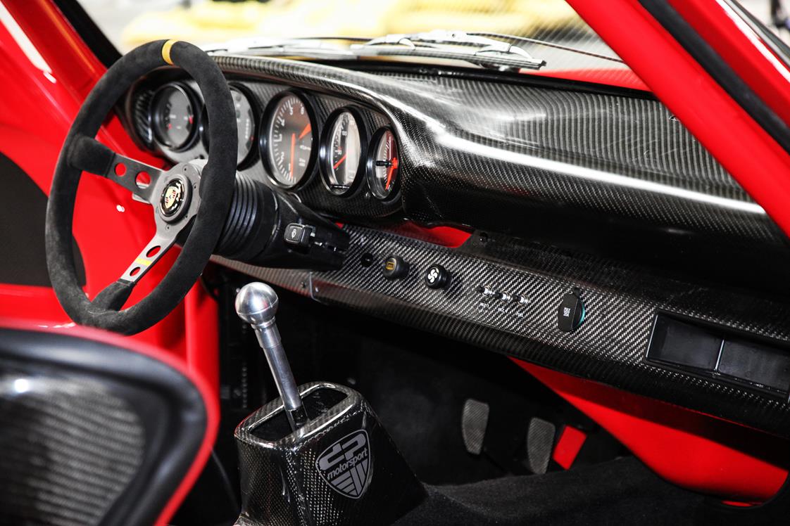Aus den Lollipop-Sitzen im Stil 935er, blickt der Fahrer auf ein 350-mm-Lenkrad von Momo und ein Carbon-Armaturenbrett mit Carbon-Knieleisten. Über dem lackierten Blech im Innenraum wurde nur ein leichter Velours-Teppich im Stil des 964 RS verlegt. Für die Sicherheit sorgen eine eingeschweißte Sicherheitszelle in rot lackiert sowie 4-Punkt Hosenträger-Gurte der Marke Schroth.