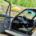 Erst der zweite – oder war es der dritte? – Satz gebrauchter Original-Magnesium-Räder brachte aber das Potenzial mit, in Zukunft für etwas sportlichere Vorhaben herangezogen zu werden. Die Bereifung: neue Michelin-Semilsicks der Spezifikation „PilotSport Cup“, die dem dynamischen Anspruch der Einteiler entsprechen. Zum Gesamtauftritt gehört wie selbstverständlich auch ein Sportfahrwerk mit sichtbarer Absenkung. KW liefert es, und zwar in Clubsport-Abstimmung: eine visuelle Ergänzung des vom Carrera RS inspirierten Auftritts. Das Interieur hat sich den Außenverhältnissen weitgehend angepasst: Recaro-„Pole Position“-Schalensitze mit Individual-Polsterung, Karbon-Elemente, Clubsport-Überrollbügel aus dem Repertoire von dp Motorsport, Momo-Dreispeichen-Lenkrad des Typs „M07“, schwarze Lederausstattung mit gelb-/schwarz-/grün kariertem Textil, dazu ein Velours-Teppichsatz in RS-Spezifikation: Das sind die wesentlichen Features im Wageninneren. Das Highlight schlechthin bleibt weitgehend unsichtbar, und das ist beabsichtigt. Die HiFi-Anlage von „Dr. Boom“ macht eindrucksvoll von sich hören. Nur zu sehen ist davon nicht viel, die Laufsprecher oder einen Verstärker sucht der geneigte Beobachter vergebens. Beides ist aber vorhanden, ganz sicher sogar. Artgerechten Wohlklang erzeugt auch der von 3.6 auf 3.8 Liter Hubraum vergrößerte Sechszylinder-Boxer im Heckabteil, der einer vergrößerten Drosselklappe seinen Zugewinn an Atemluft verdankt. Ein in PS-Leistung und maximalem Drehmoment erstarkter Motor (318 PS, 361 Newtonmeter) erfordert naturgemäß auch ein Plus an aktiver Fahrsicherheit. So mussten die von der Generation 993 zugerüsteten Bremsen durch die Original-Bestückung des 964 Carrera RS ersetzt werden. Nun sieht der Blick durch die Felgenarme fast schon so aus wie 1992 anlässlich der Produktvorstellung. Auch die Fahrzeughöhe entspricht der des einstigen Sportmodells, hervorgerufen durch ein KW-Gewinde-Straßen-Sportfahrwerk in Clubsport-Abstimmung. Die Stabilisatoren steuerte H&R zum Gesamtbild bei: ein außergewöhnlicher Kanon zweier Marktführer auf diesem Sektor.